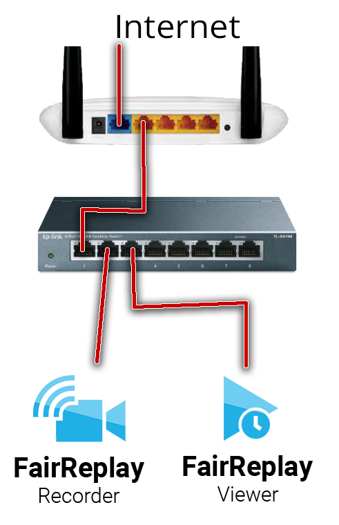 Tp-Link router and switch is used in example. For multiple clients we recommend at least 2.5 Gbps uplink to Recorder. Clients are OK with 1Gbps.