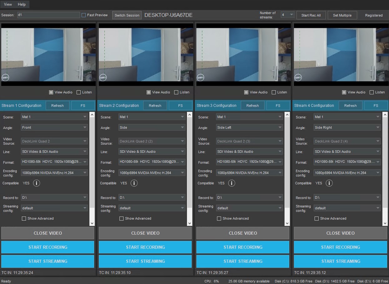 DeckLink Quad 2 (4) on the fourth. - Format and Record to - Set the camera format for each stream configuration (in our case 1080i5994). Also, set Record to drive D for each configuration.